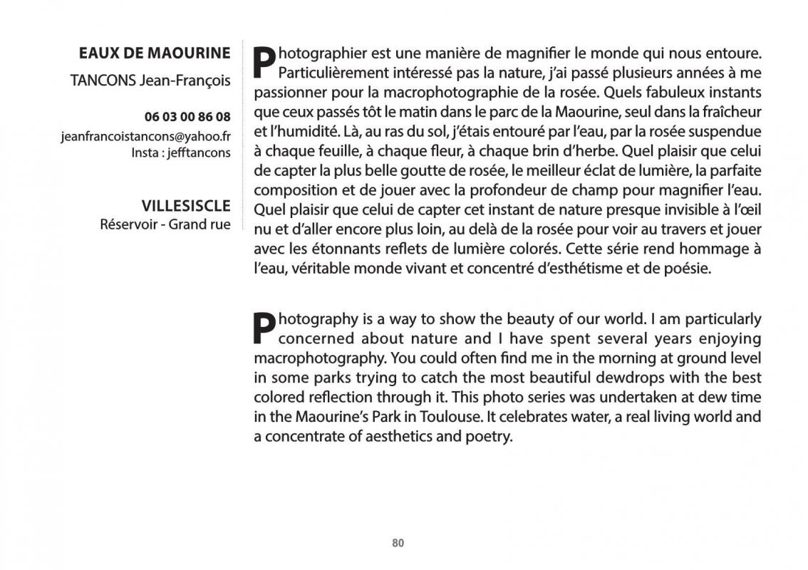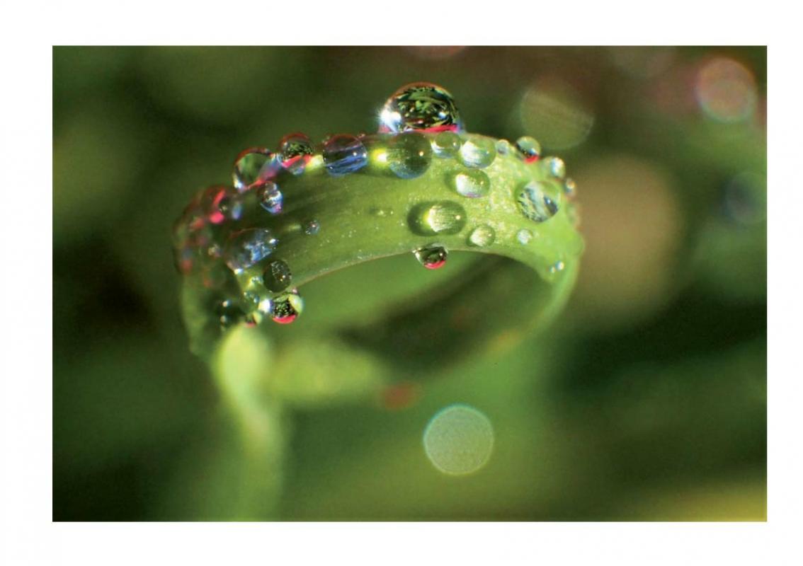 composition et de jouer avec la profondeur de champ pour magnifier l’eau. Quel plaisir que celui de capter cet instant de nature presque invisible à l’oeil nu et d'aller encore plus loin, au delà dela rosée pour voir au travers et jouer avec les étonnants reflets de lumière colorés. Cette série rend hommage à l’eau, véritable monde vivant et concentré d'esthétisme et de poésie.