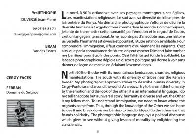 Exhibiting at the end of 2018 at the Addis Foto Fest in Addis Ababa, I discovered this huge country with wonder. North 90% orthodox with its mountainous landscapes, churches, religious manifestations. The south with its diversity of tribes near the Kenyan border. My photographic approach strives to describe human diversity in Cergy-Pontoise and around the world. As always, I try to transmit this humanity by the emotion and the look of the other, it is an international language. I do not tell anecdote but a universal story: humanity is diverse and yet, the Other is my fellow man.To understand immigration, we need to know where the migrants come from. Thus, through the knowledge of the Other, we can hope to love it and break down our barriers to build bridges. It is the otherness that founds solidarity. The photographic language deploys a political discourse which gives to see without giving lesson of morality by enlightening the consciences. Et aussi au Gîte du Domaine de Seignou à Ferran : "Cergy Faces"